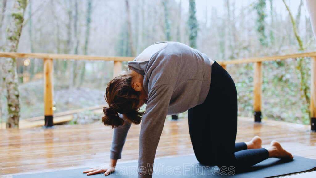 Sit upright with hands on your knees. Inhale and arch your back, lifting your chest (cow pose). Exhale and round your spine, tucking your chin (cat pose). Repeat 8–10 times.
